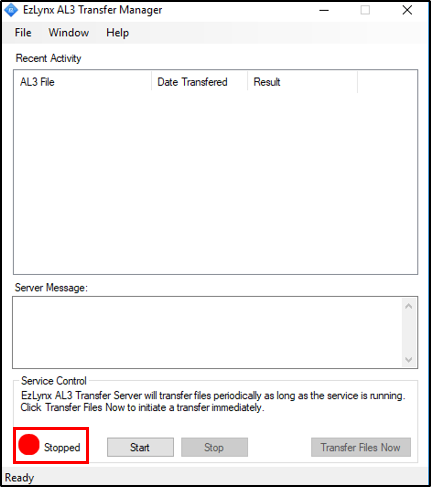 3. If there is a red circle in the bottom left-hand corner that says "Stopped", the EZLynx Transfer Manager has stopped and needs to be restarted via the Windows Services.