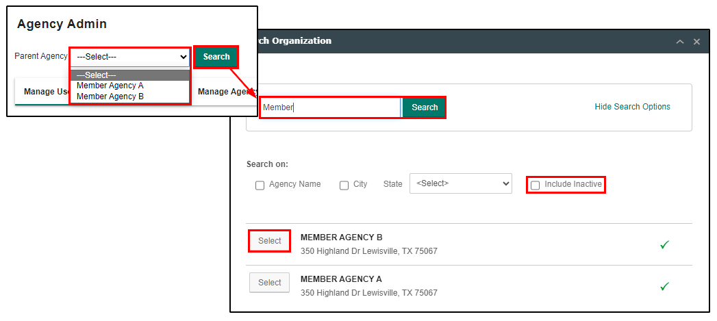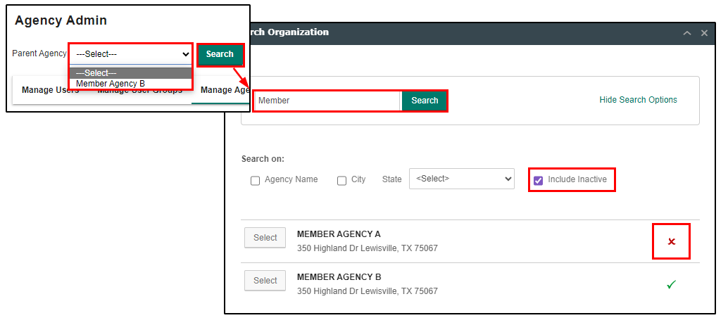 You'll also notice that the Member Agency is no longer available in the search dropdown and can only be found using the Search button and checking the "Include Inactive". For disabled member agencies you'll see displayed a red "X" to indicate the disabled status.