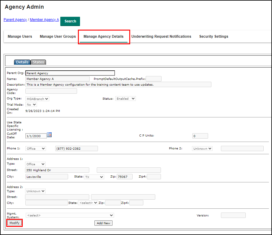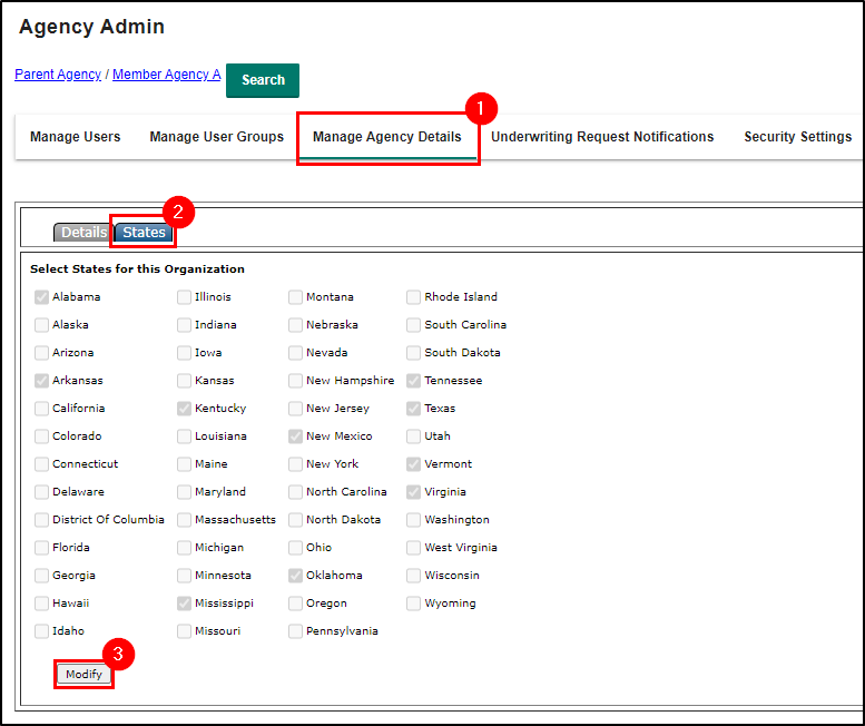 3. Select Manage Agency Details. This will refresh the page and display the member agency's details. Select the States sub-tab. This will also refresh the page and display the states for the member agency. Select Modify at the bottom of the page. This will make the checkboxes available to select.