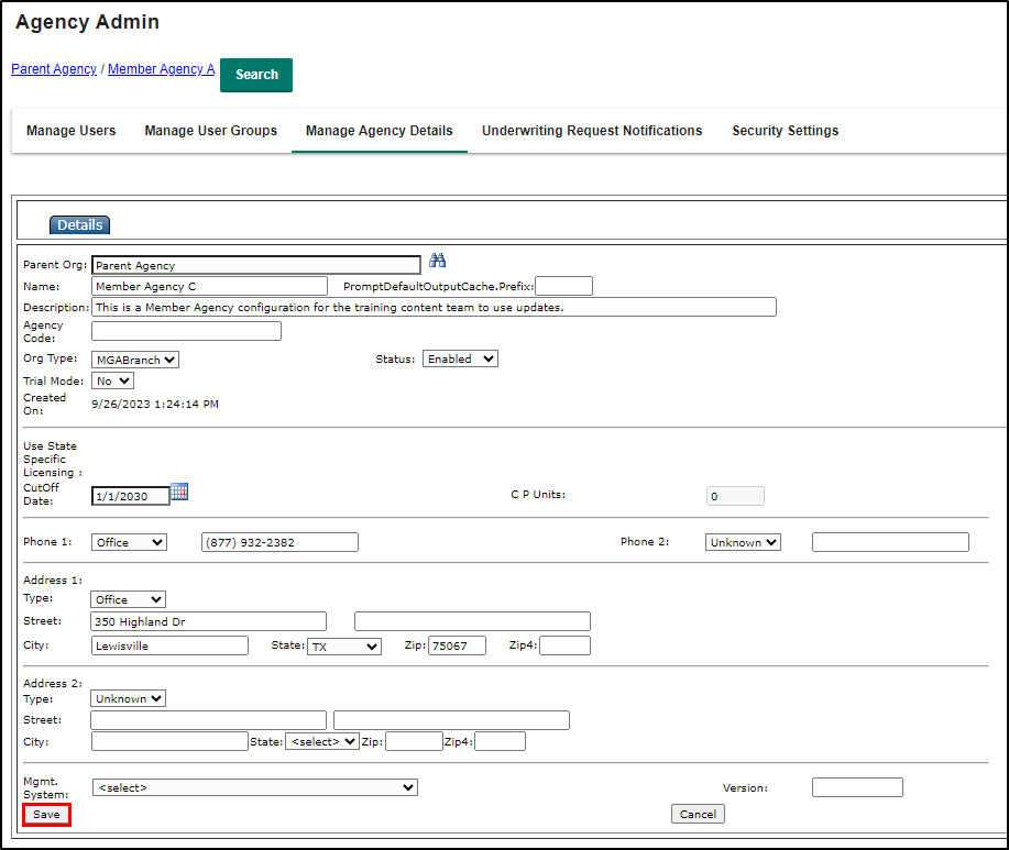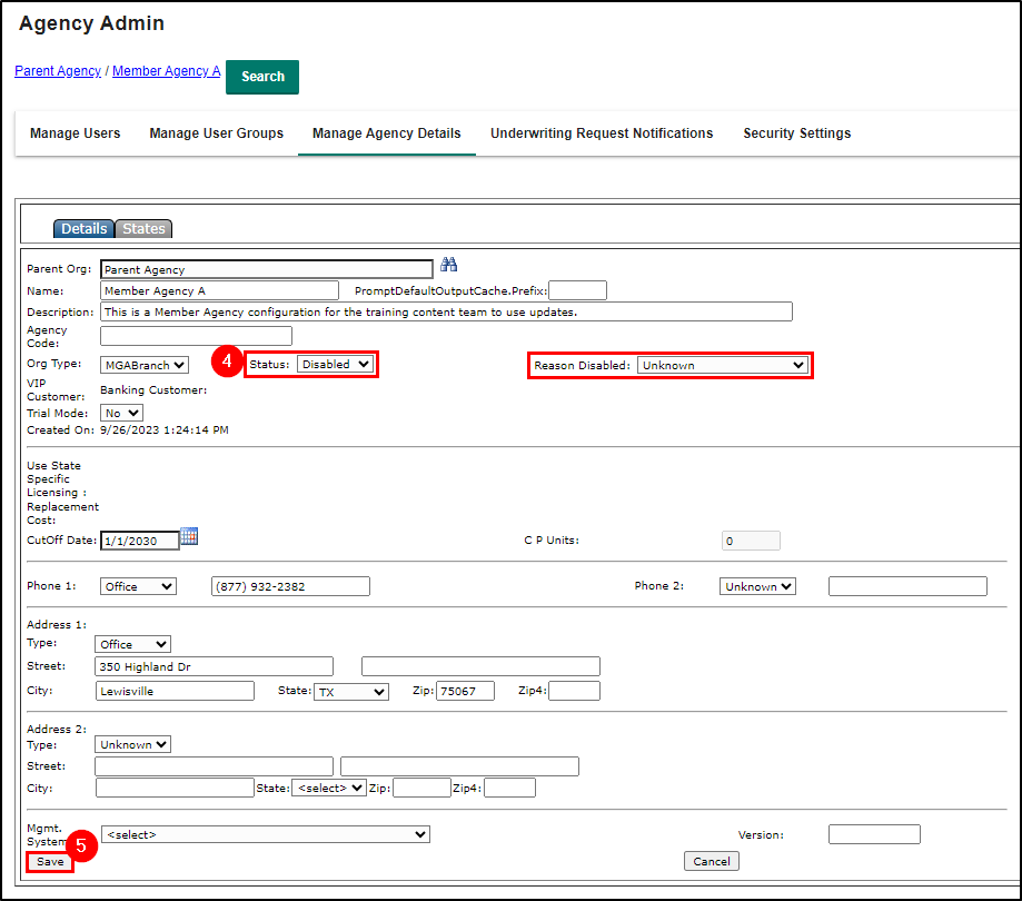 5. Select the Save button. The screen will refresh the page and you will now see that the Status of the Member Agency is disabled.