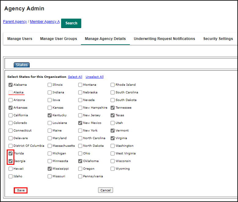 4. Check the box next to a state to add it to the member agency. Uncheck the box next to a state to remove it from the member agency. Once you have made your adjustments, select the Save button at the bottom.