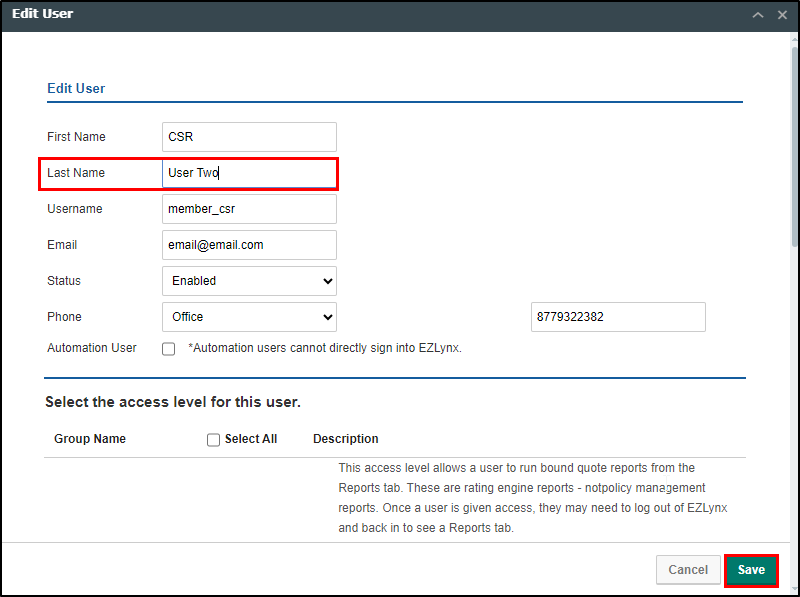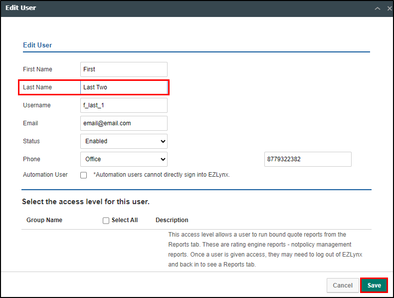 3. Use the various fields to adjust the user's information and then select the Save button in the bottom right. This will refresh the page and close the Edit User Window.