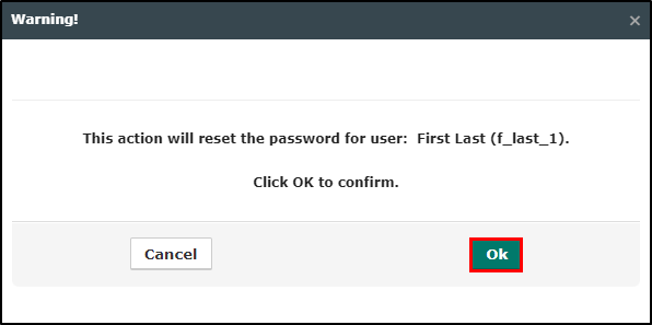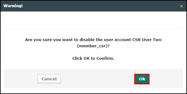 3. On the Warning window, confirm you want to disable the user by selecting Ok. This will refresh the screen and close the Warning box.