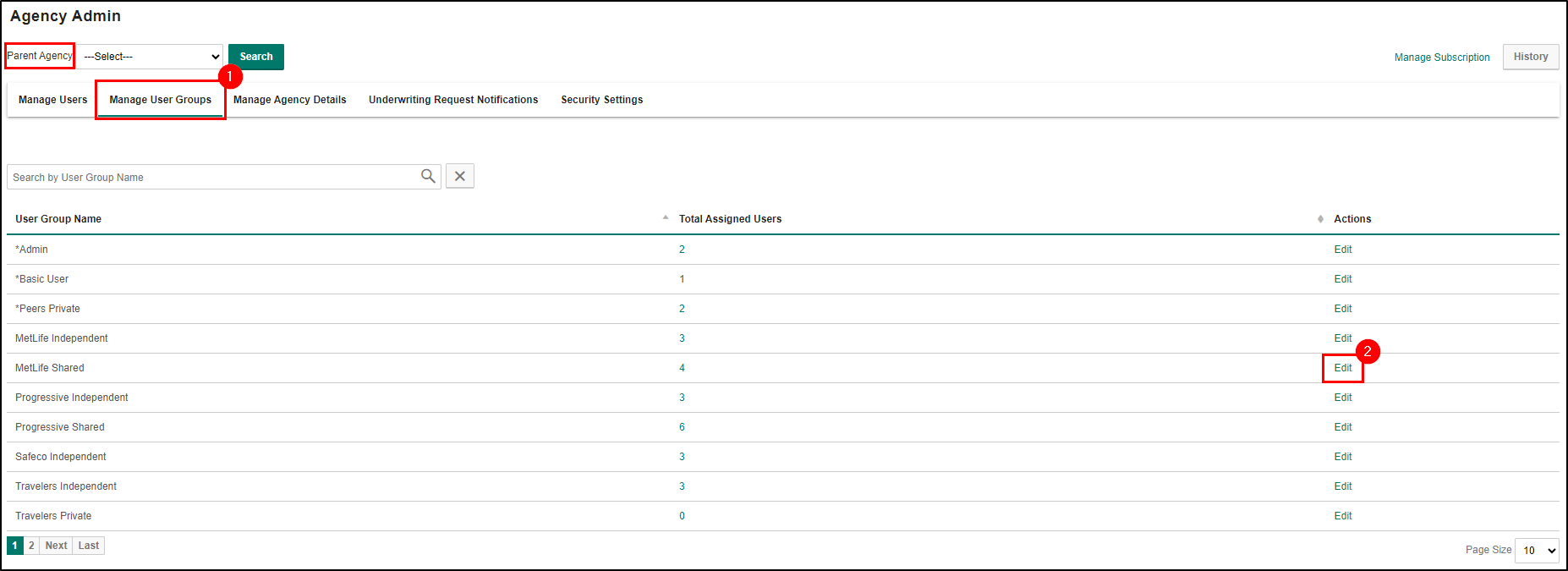 ![]() | Attention! - The Manage User Groups section should only be used to give bulk access to carriers. We do not recommend using this feature to grant additional product access to member agents as it could be confusing which product groups are at the AP Main vs the Member Agency. |