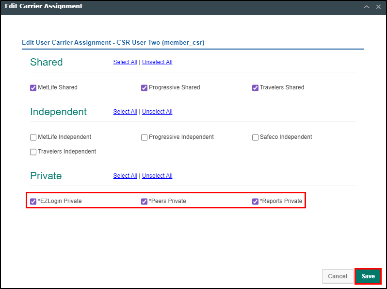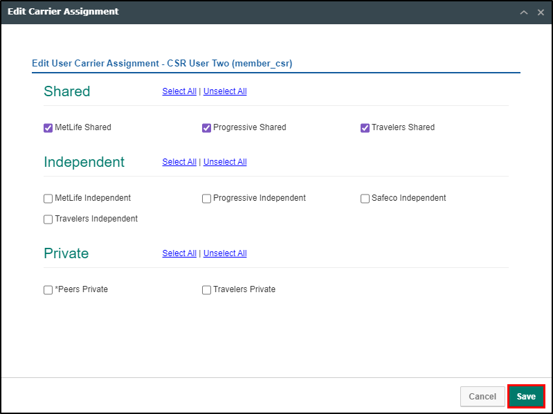 4. Check the carrier boxes to give access and uncheck the boxes to remove access. Once you are ready, select Save at the bottom. This will close the Edit Carrier Assignment window and refresh the page.