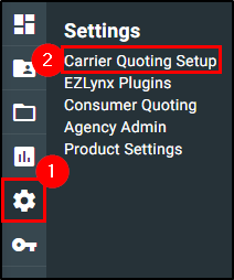1. In your EZLynx account, hover over the Settings (gear) icon on the left navigation bar. Then, choose Carrier Quoting Setup. This will take you to the Manage Carriers page.