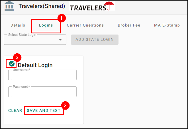 3. Select the Logins tab and enter the username and password for the carrier site. Then, select the Save and Test option. If the logins are successful, you'll get a green checkmark.