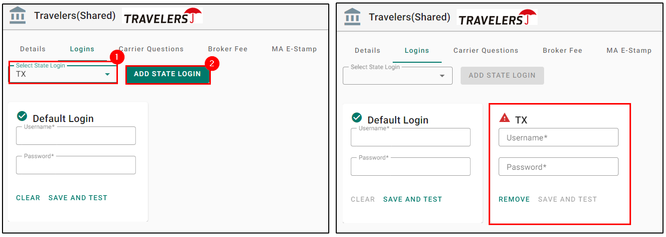 OPTIONAL: If a carrier is setup with state-specific logins, you can add a state specific login after setting the default login. Use the Select State Login dropdown to select the state you would like to add a login for. Then, select the Add State Login button. This will add a new login section with the state as the title and you can follow the same steps you did for the default login.
