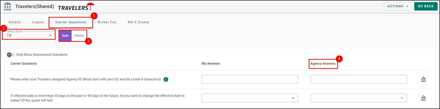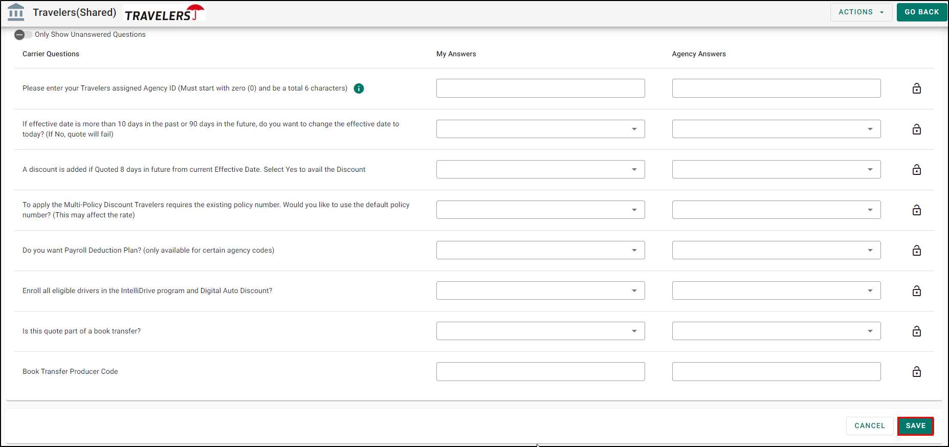 6. Under the Agency Answers column, input the Agent/Producer code. An Agent/Producer code must be set for every Shared Carrier or member agents can't run quotes. Also, leave the lock icon unlocked. Do not lock these fields. Agent/Producer codes inputted in this fashion will never be visible to the member agent. It will either be masked or invisible.