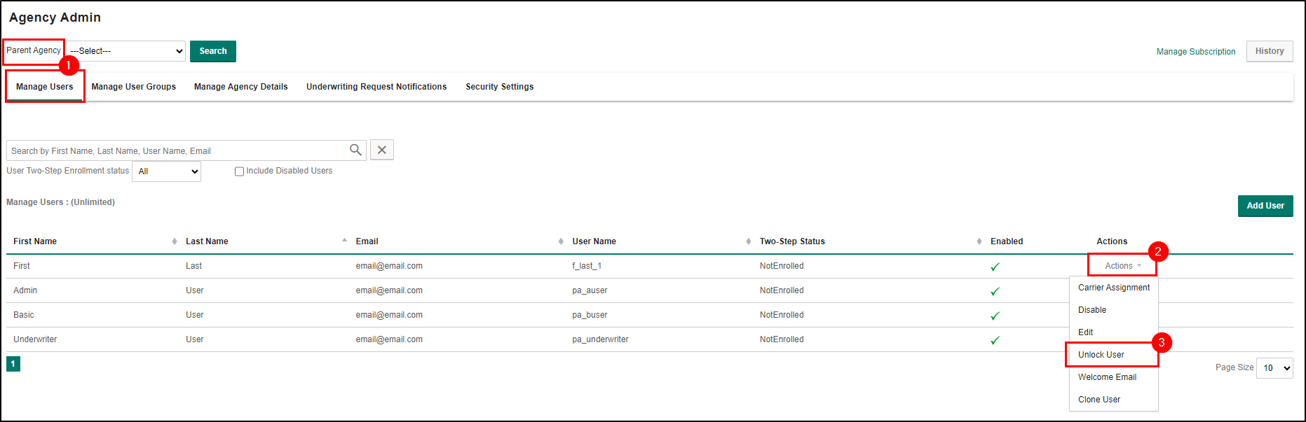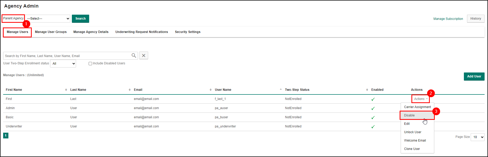 When an AP Admin User should no longer have access to EZLynx, their user account must be disabled. This could happen because they have left the AP.