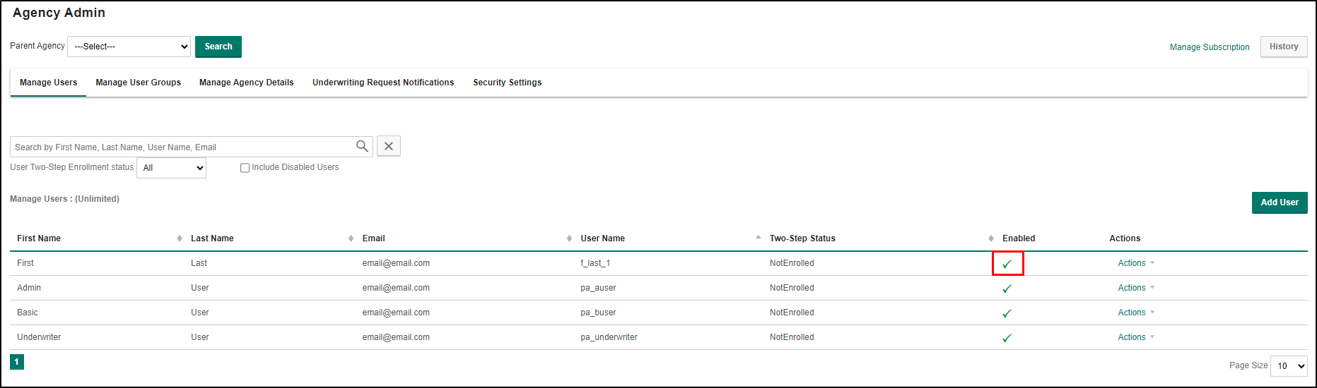 You'll notice that the user is now on the list on the Manage Users page. For enabled users, you'll see displayed a green checkmark icon to indicate the enabled status.