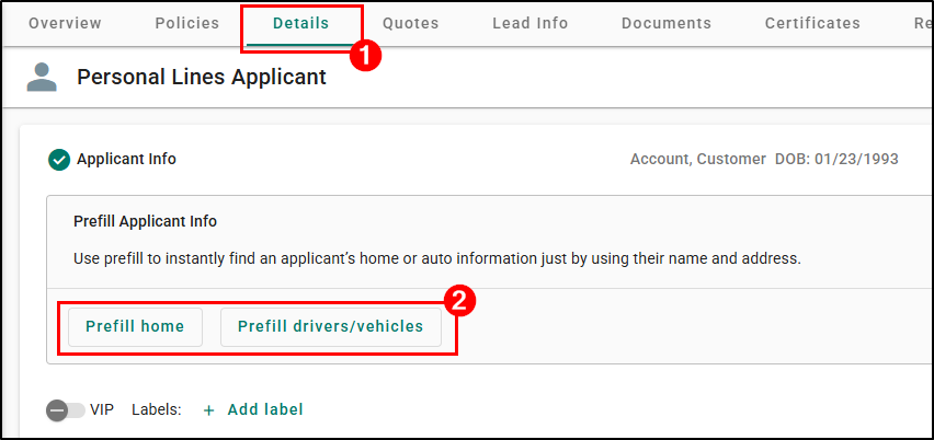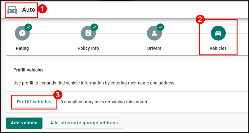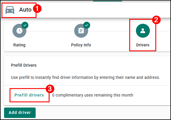 - If accessing Driver/Vehicle Lookup from the Auto Application, either from the Drivers or Vehicles tab, choose the Prefill drivers or Prefill vehicles button.