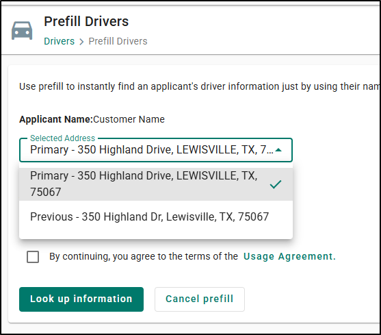 3. Next, you will have a chance to review the pre-fill details. At the top of the page, you will find the address that was selected on the earlier step as well as the drivers that were found in the completed search.