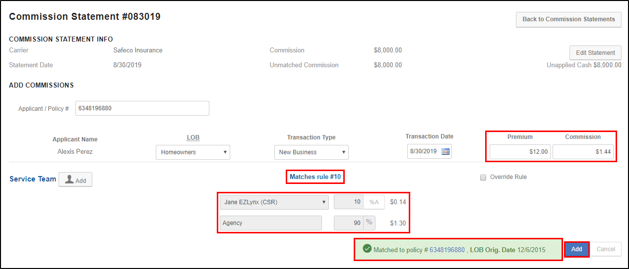 To reconcile a commission statement, the total of the matched line items must match the total of the commission statement. To accomplish this, all line items must match a policy in EZLynx. If any unmatched line items exist on a statement, they must be manually matched to the appropriate policy. Chargebacks and carrier fees often have to be manually added as a line item and matched to the “dummy chargeback” applicant.