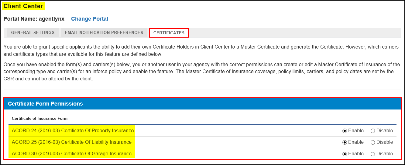 The agency can enable certain Certificate Masters so that a customer can log into Client Center, add a certificate holder and generate a certificate on their own. Only certain certificate types and carriers are supported. The certificate’s coverage, policy limits, carriers, and policy dates are set by the EZLynx user and cannot be altered by the applicant.