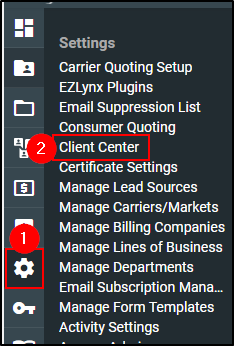 • Hover over the EZLynx Settings icon, and select Client Center.