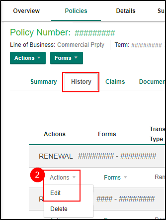 2. Then, click the History tab and on the transaction you would like to edit, click Actions > Edit.