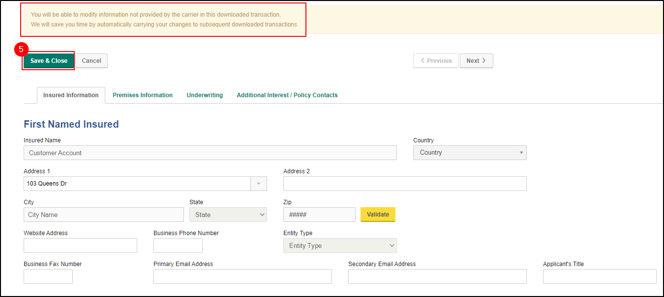 5. Once in the policy entry screens, you'll notice the fields that contain the downloaded data from the carrier will be inactive and the values cannot be changed. However, you can input the supplemental information for vehicles, drivers, coverages, additional interests, and more! Simply work through the tabs left to right just like you would a manual policy. When you are done, click the Save & Close button.