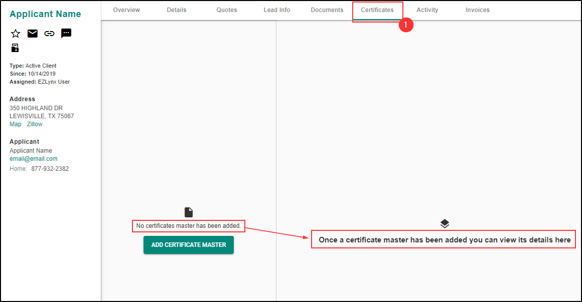 To aid in the accessibility of the Master Certificates, we created a dedicated 'Certificates' tab. On an Applicant, click the Certificates tab. If a Master Certificate has never been created for this Applicant, there will be a message that states: "No certificate master has been added. Once a certificate master has been added you can view its details here."