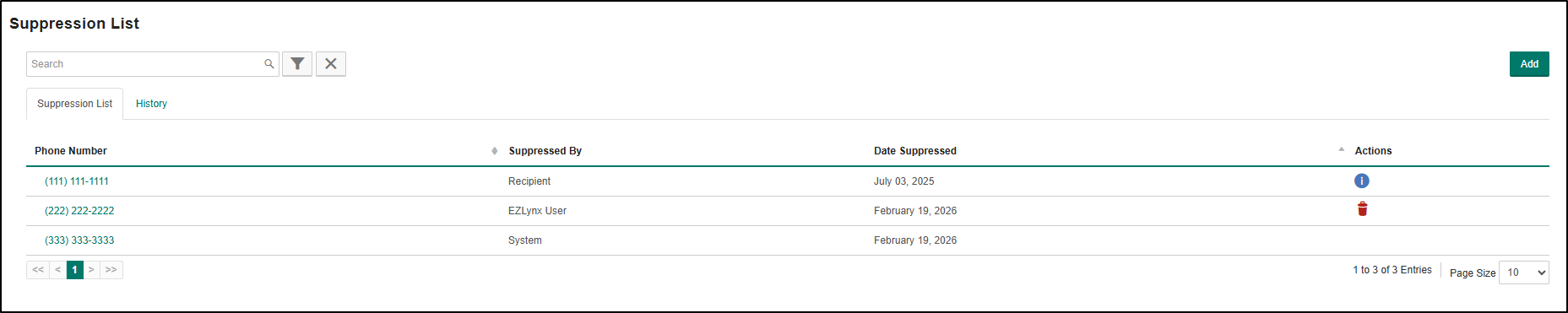 - If the phone number was suppressed by the recipient, you will not be able to take action on it. An information icon will display verifying the phone number cannot be removed from the suppression list.