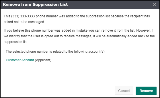 2. Once you have read the warning message, select the Remove button on the bottom-right. This will close the window and refresh the page where the number will no longer be on the Suppression List.