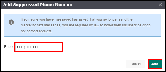 1. Select the Add button in the top-right. This will open the Add Suppressed Phone Number window.