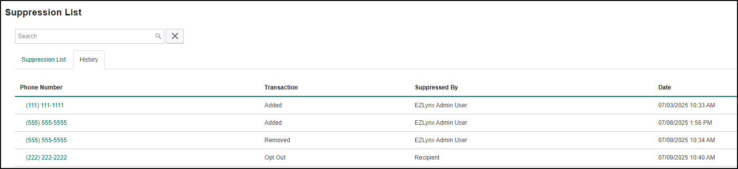 The History tab on the Text Messaging Suppression list logs all the suppression related events to any phone number. It displays the history of opting out and opting in. It shows the following information:
