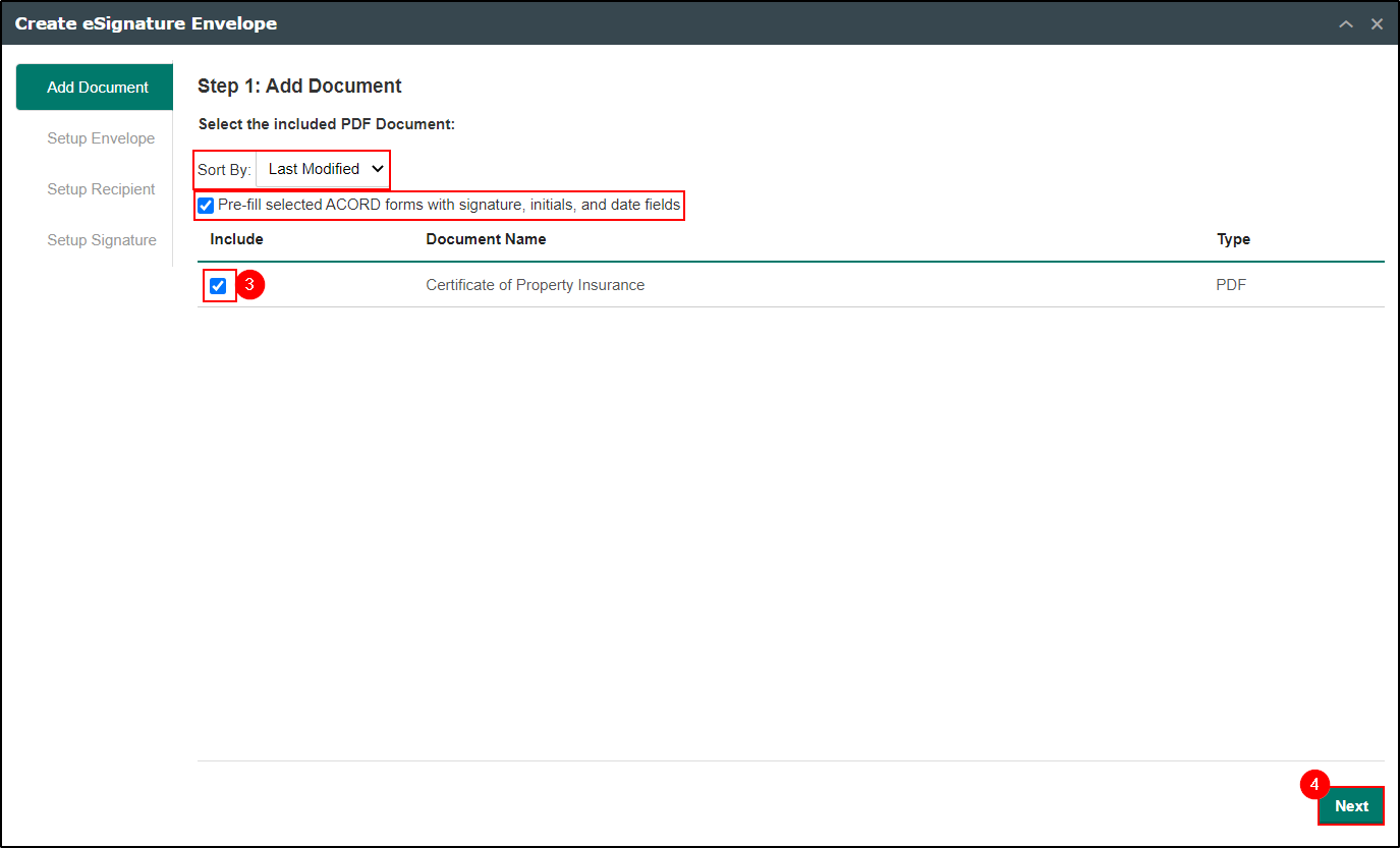 ![]() | Did you know? You can sort through your documents by using the Sort By drop-down to find the most recent documents, and if you check the Pre-fill selected ACORD forms with signature, initials, and date fields the system will automatically place those items for you in a later step meaning you have less manual work to do. |