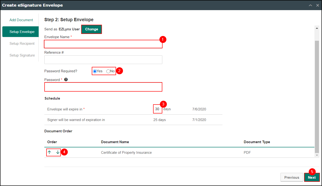 3. Set the number of days the envelope with expire. A reminder email is sent to recipients 5 days prior to the envelope expiration date.