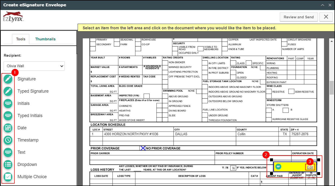 Now it's time to place the boxes for recipients to electronically sign! If you checked the Pre-fill selected ACORD form with signature, initials, and date fields on the Add Document step, then you will already see that some boxes have been placed for you. There are several different options available to use and the best part is you can have multiple on the same eSignature document.