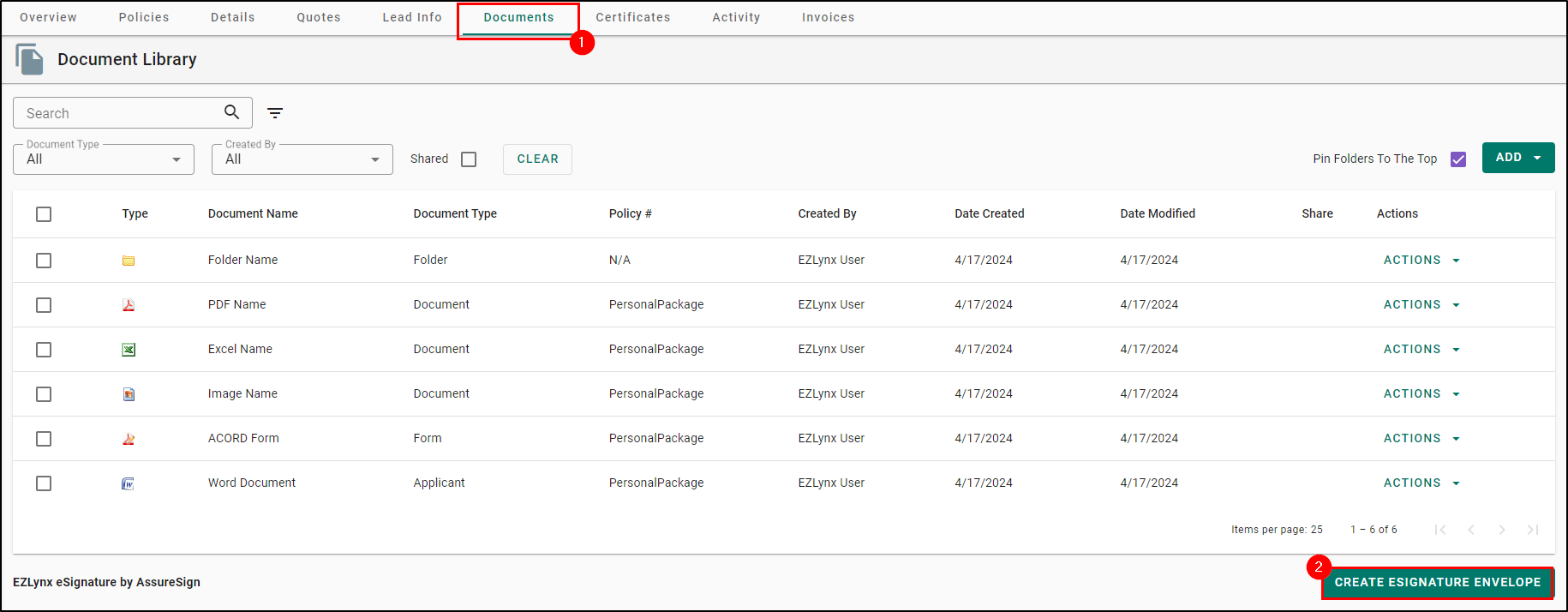 Before creating an eSignature envelope, you need documents to place in the eSignature envelope. The document must be a PDF and that document must be available in the customer's Document library. You can add ACORD forms from the Management System product or you can upload documents from your computer. See: How to Add or Upload Documents for more information.