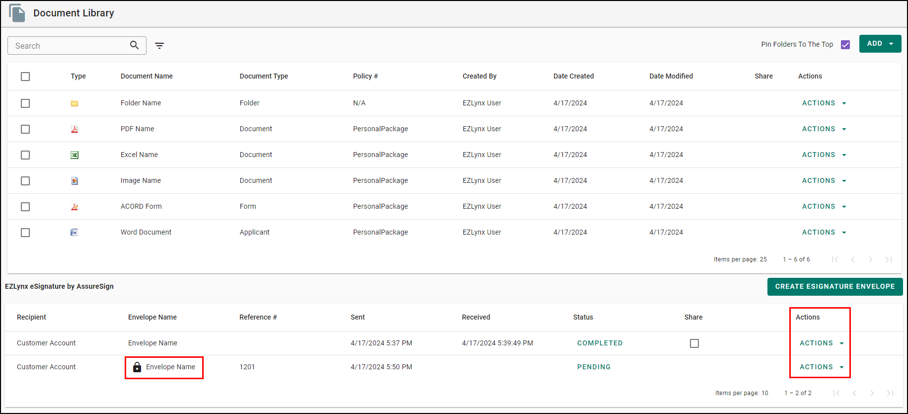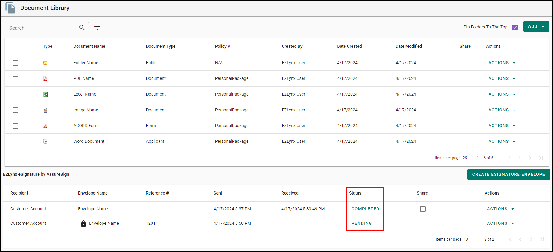 The EZLynx eSignature section of the Documents tab stores all of the eSignature envelopes that have been created for that particular customer. This is where you can see the status of the customer's envelopes and view, resend, cancel, or email the eSignature.
