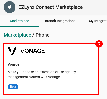 A Connect Marketplace Admin can enable the Vonage Integration from the Connect Marketplace icon under the Phone category.