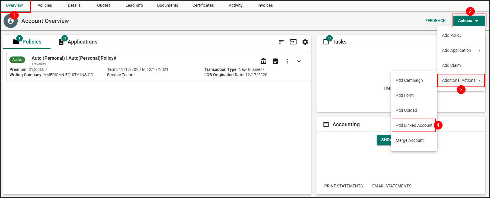 Linking 2 accounts together is a great way to stay efficient when you are navigating EZLynx. A common example of when you might want to link accounts is if you service both a Personal Account and a Commercial Account for someone. If the accounts are linked and the customer calls, you can easily switch between the 2 accounts depending on what the customer is needing.