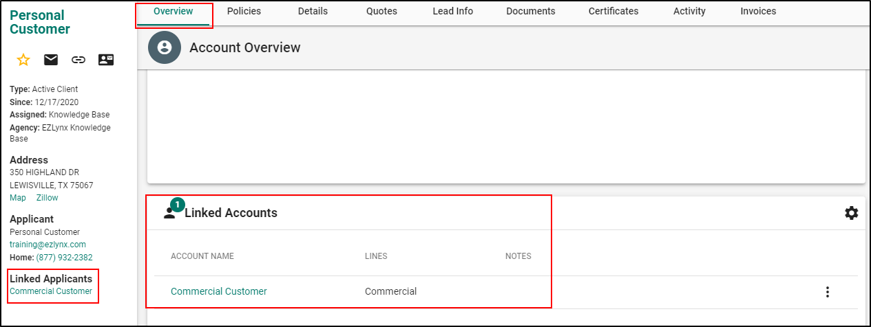 Once you refresh the page, you can now see on the Overview page a new box that has the Linked Account. If you click the Customer's Name it will take you to that Customer's Overview page. You can also see that the same link has been created on the Customer's Info Pane for easy access even if you aren't on the Overview page.