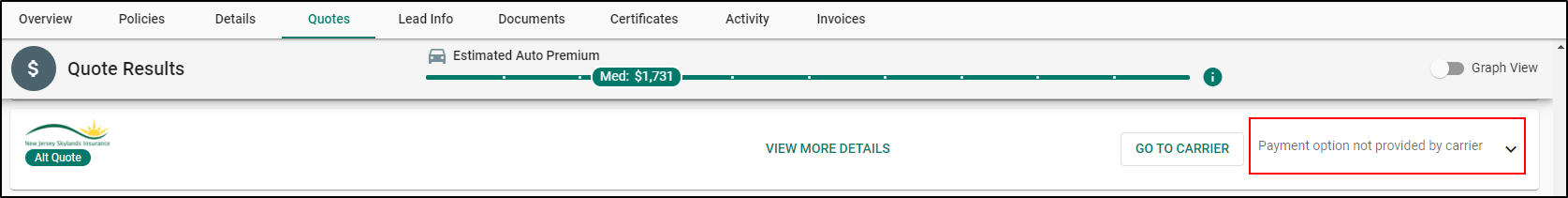 Carriers return various payment options with their EZLynx quotes. The EZLynx Quote results page includes a Payment Option dropdown menu that includes the following options: Full Pay, EFT Premium and Monthly Premium. When this message appears, it means the carrier did not send the information back to EZLynx for the selected payment option. To resolve, simply change the Payment Option dropdown to Full Pay Premium. On the carrier site, there may be additional payment options, but they didn't send all the data back to EZLynx.
