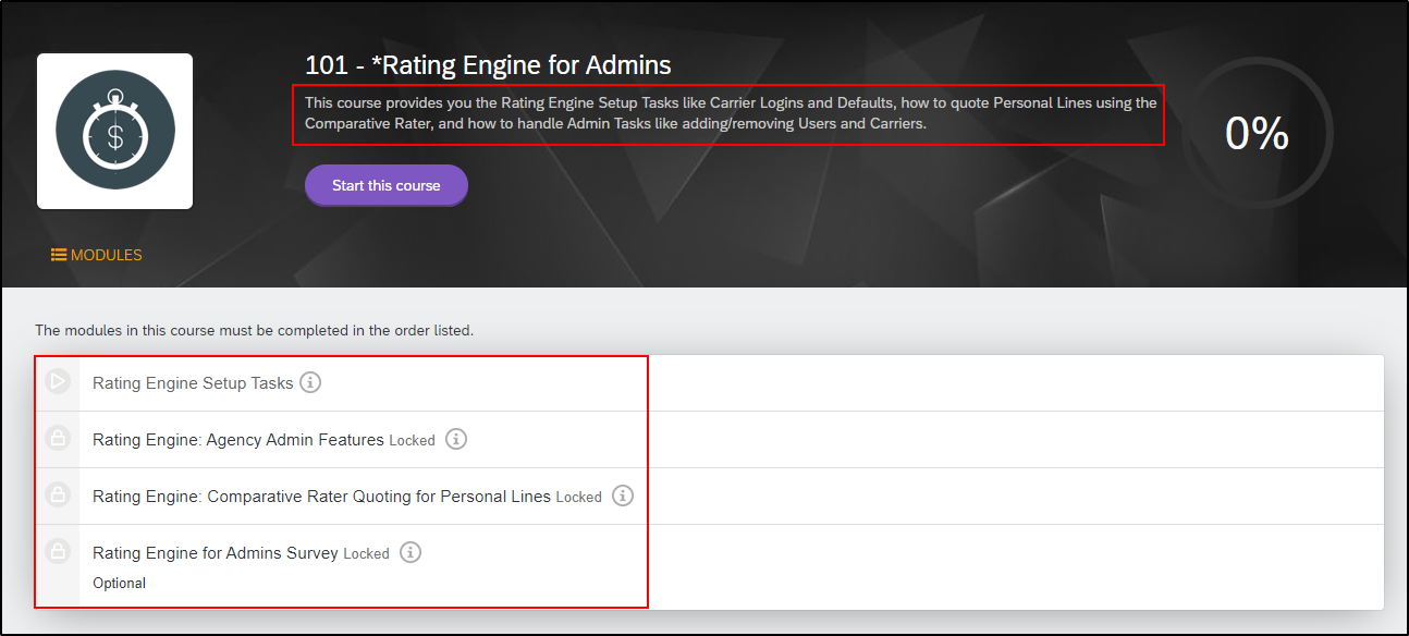From here you can see the full description of the course and the modules that are included. You can also see the percentage of the course you have completed. Normally, this will be 0%. However, let's say you were a CSR or Producer who has been recently promoted. If you took the CSR & Producer version of a course and were recently assigned the Admin version of the same course, you percentage should be more than 0%.
