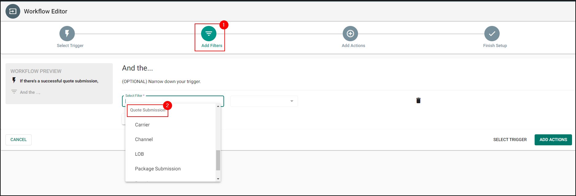 Agencies can refine the trigger by applying filters like Channel, Resubmission, Package, Premium under Quote Submission filter. This gives the agent the flexibility to run the workflow as per the filter criteria. Workflow will be triggered only when submitted quote fall under the filter criteria selected by the user.