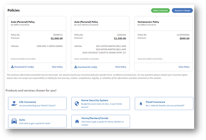 The cross-sell integrations you have enabled for Client Center will be displayed on the Policies page in Client Center. This also includes the Personal Lines cross-sell opportunities for Auto, Renters, Home, & Condo that was implemented in the previous release.