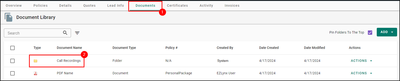 Once a recording has been downloaded, you can access it from three different places within the EZLynx Management System: