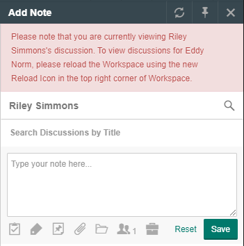 For example, if you are adding a note for Sarah, one of your customers and Dave, another customer, calls in to update his address on file, the Workspace will not automatically reload to show Dave's information if you navigate to Dave's account page. Unless the Workspace is reloaded using the new Reload icon or is closed and reopened again, you will continue to see Sarah's information shown within Workspace.
