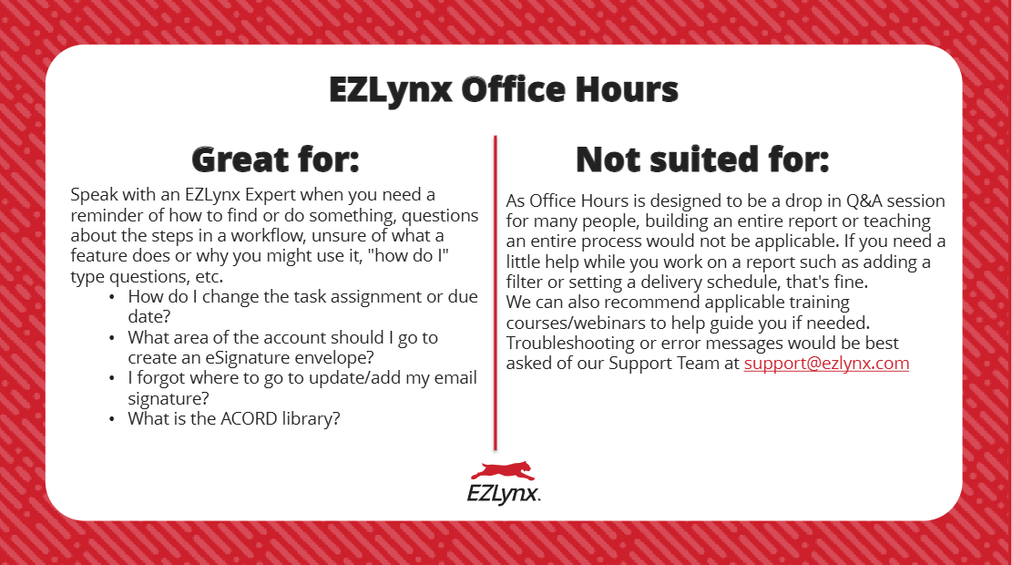 What: Office Hours is a public, drop-in Q&A session to ask specific training questions as you learn, practice, & apply EZLynx workflows.