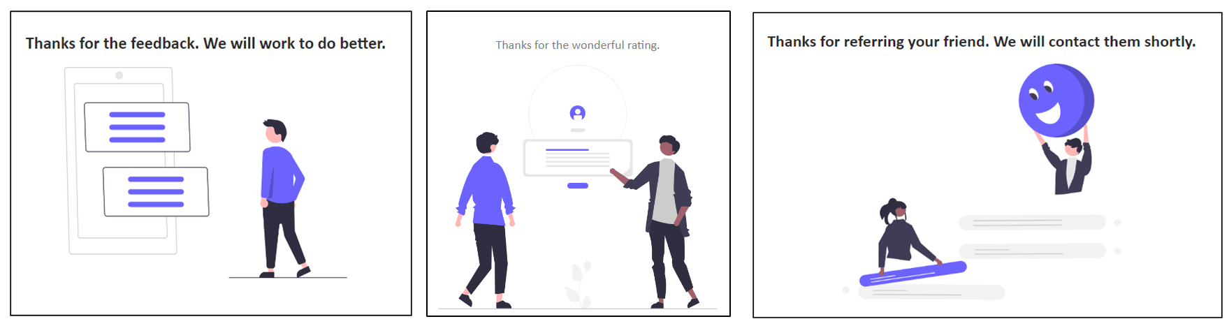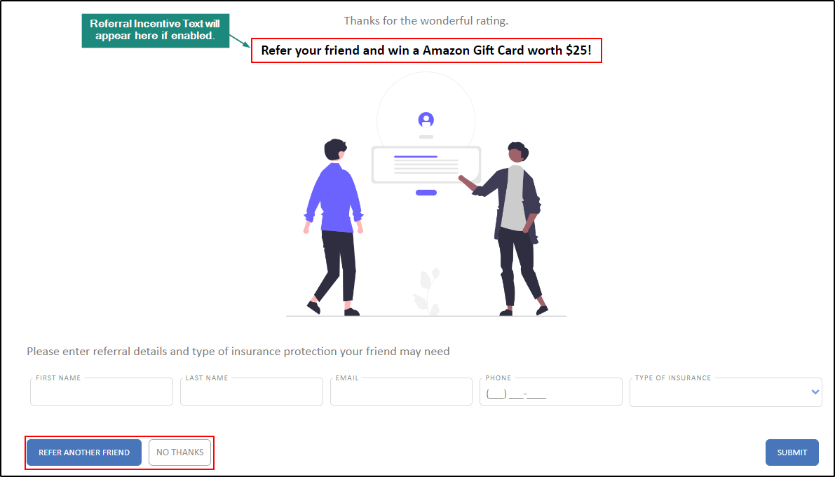 For an example, let's talk about the text box "Enter referral incentive text". By default this text box is blank, however, you can specify an incentive you want to provide to your consumers for bringing in referrals. If a consumer provides a rating of 4 or 5 stars, they will see the incentive message inciting them to refer someone!