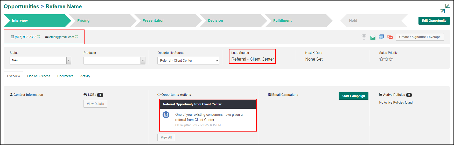 If your Sales Center Admin has the Create New Opportunities automated event turned on, then the system will also automatically create a sales opportunity in Sales Center for the referee and set the opportunity source to Referral - Client Center. This way you can easily tell who are referrals while using Sales Center.