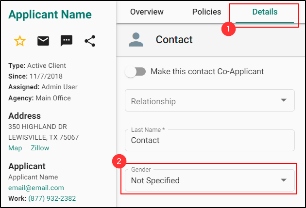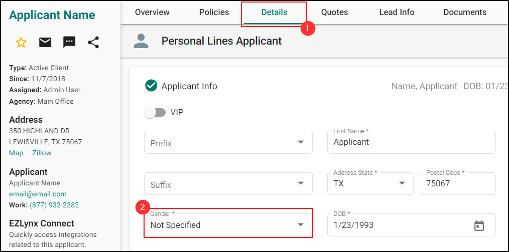 For a new or an existing applicant, a new "Not Specified" option as a gender type in the details section of Auto, Home, & Dwelling Fire LOB for all the rating states can be seen.