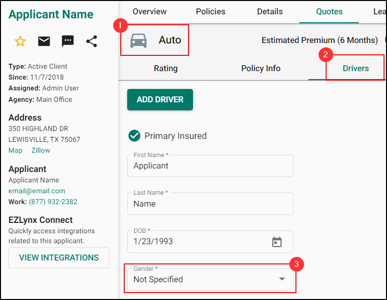 For an Auto Rating Application when a driver is added or modified, a new "Not Specified" option as a gender type can be seen.