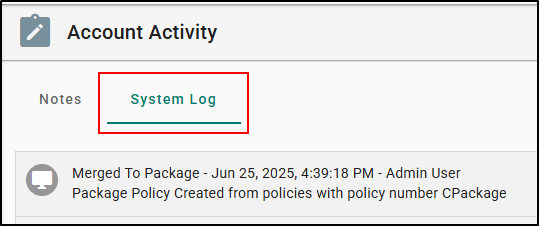 Finally, in the system log, you will find entries for Merged to Package, Manual Policy Archived, and Policy Modified to document that the Package Merge happened, that the singular policy was removed, and that a Change Request transaction has been entered for the selected LOBs.