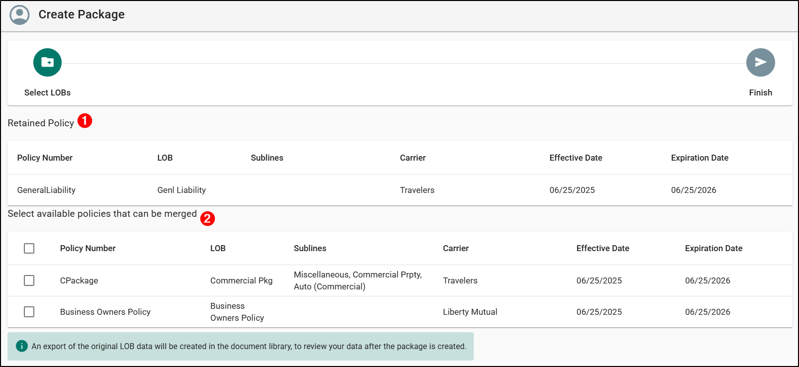 - Please note, the policy number for the package will be the policy number of the retained policy. Meaning you should start the workflow from the policy you want to retain the policy number from.