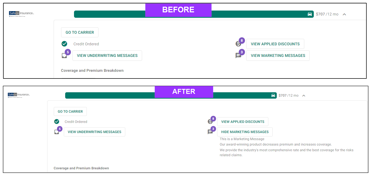 With this release, you will be able to see the "Marketing Message' by default when you expand a quote of a carrier on the quote results page, if the carrier has sent a message.