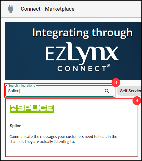 From the Connect home page use the Search Integrations bar to type SPLICE. When the integration card comes up, click on the SPLICE Card.